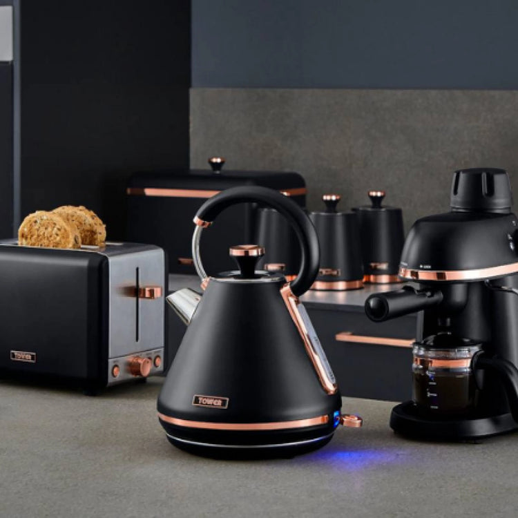 Shop our Black Modern Kitchen Aesthetic Set can add a sleek and contemporary touch to any kitchen space. The cohesive look of matching items like kettles, toasters, canisters, bread bins, towel poles, and mug trees can create a stylish and unified design theme. Elevate the overall appearance of these matching home electricals.
