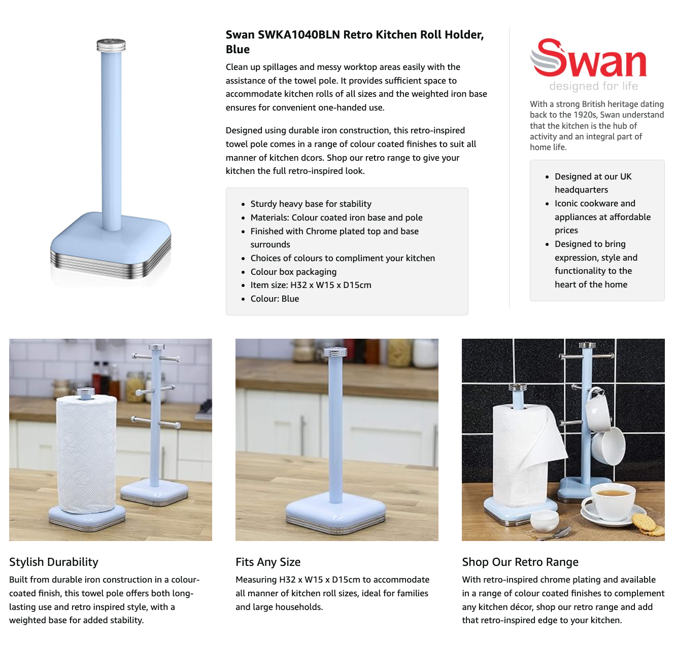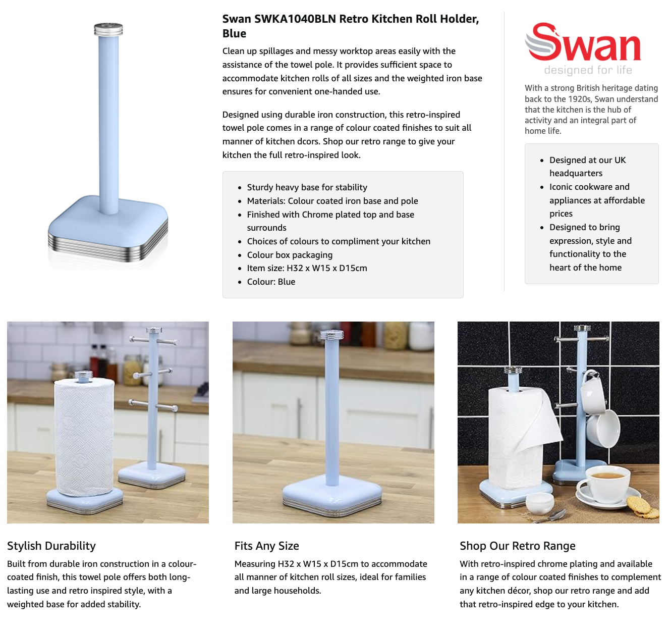 This paper towel holder has matching items in the Swan Retro range; 2 years guarantee
