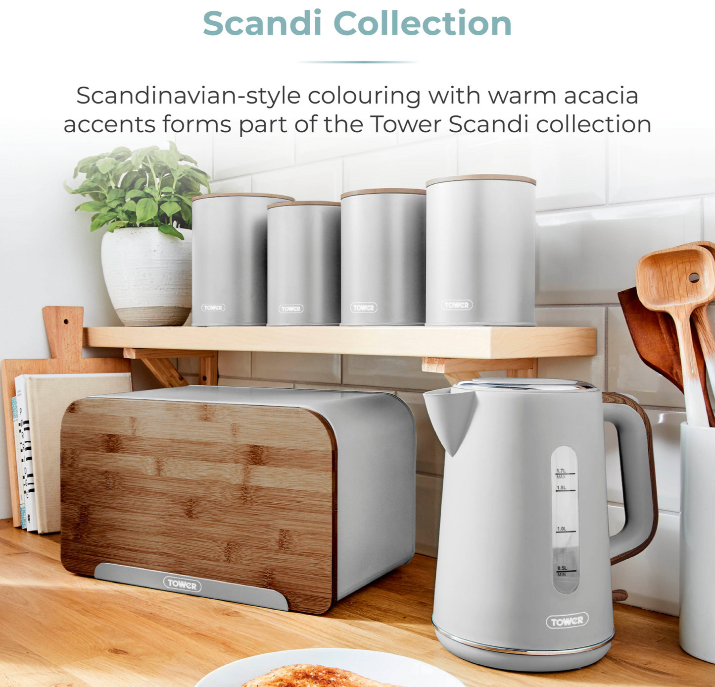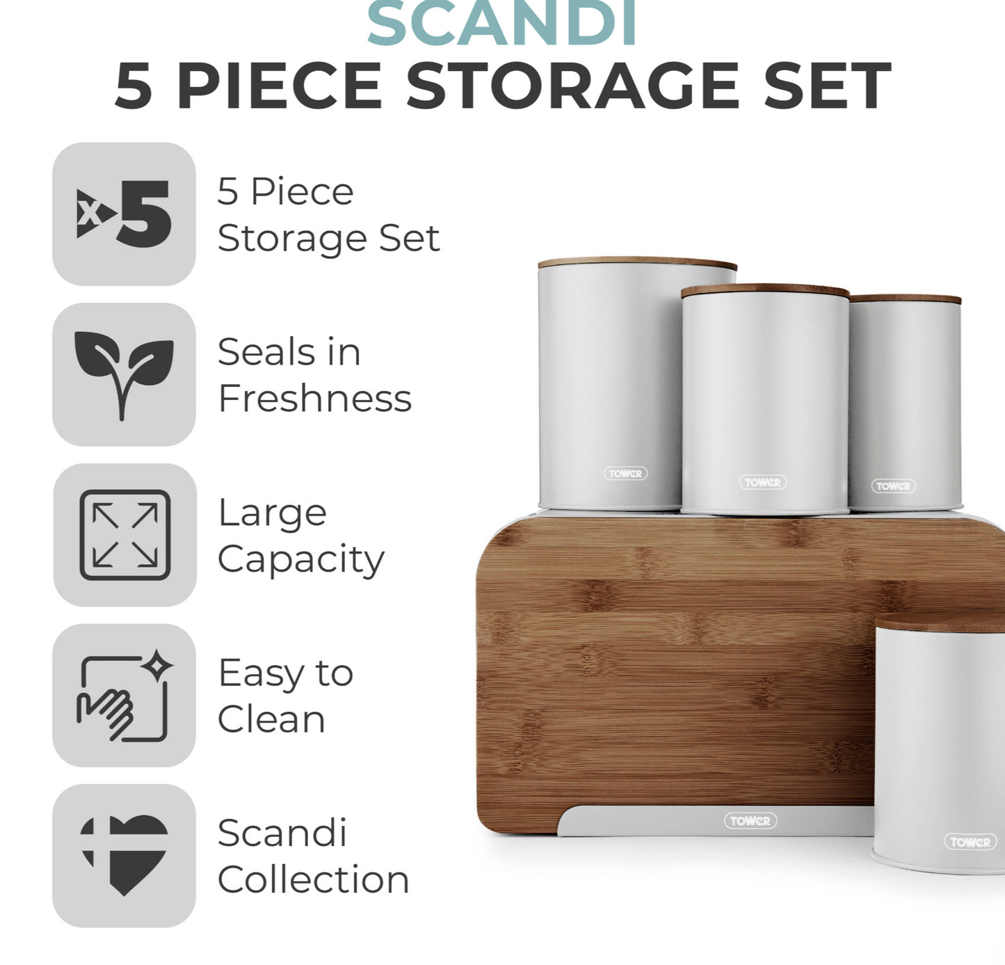 The Tower Scandi 5 piece storage set gives you access to all your essential ingredients right from your kitchen worktop.