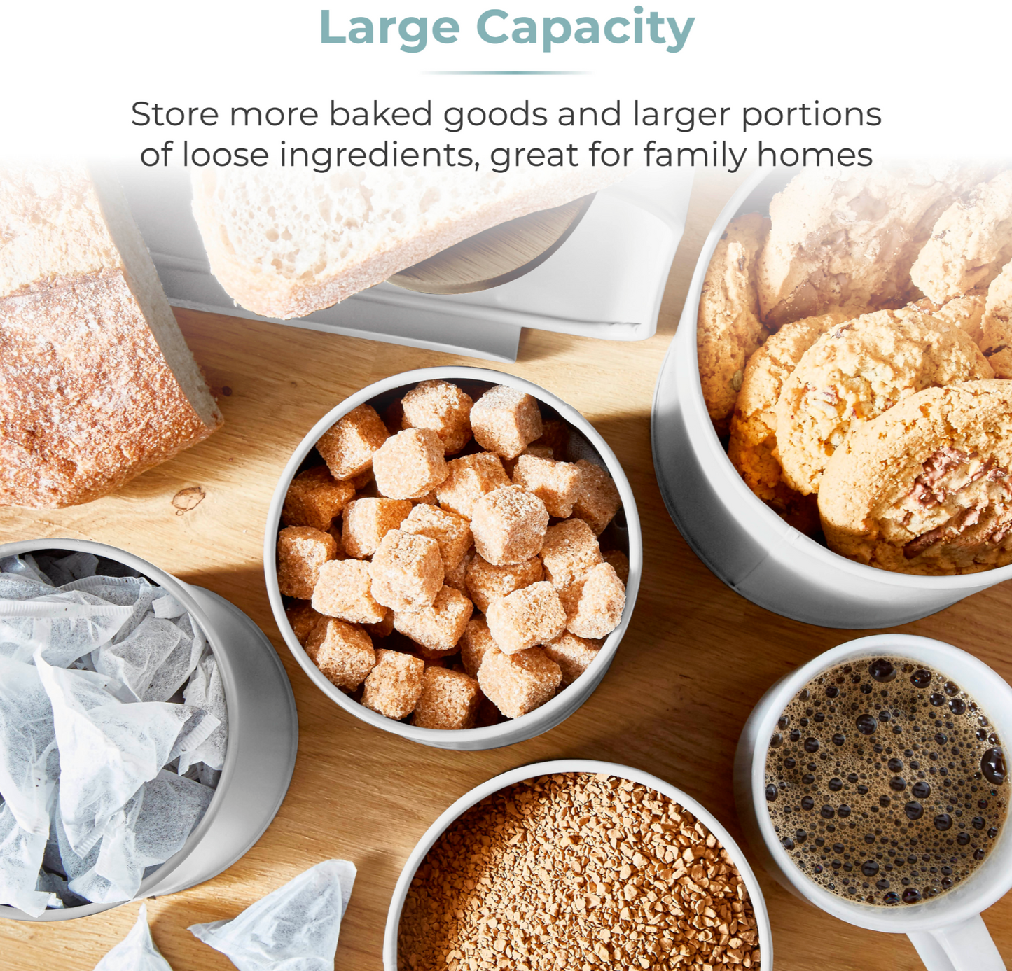 The bread bin and biscuit barrel can storage large amounts of baked goods fresh for longer, while the canisters provide ample space for storing coffee, tea, sugar, or other loose ingredients.